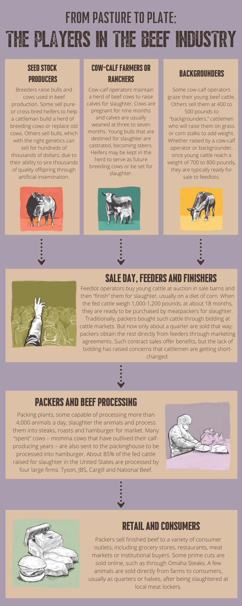 Many farmers and ranchers blame the market conditions on the extreme consolidation in the nation’s meatpacking industry. Today, some 85% of the fattened cattle that are turned into steaks and other choice cuts of meat in the United States are slaughtered by just four giant international processors.