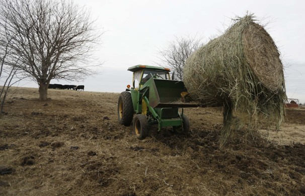 (Orlin Wagner/ Associated Press ) – In this Tuesday, Feb. 12, 2013 photograph, Randy Cree picks up a bale of hay while feeding cattle on his farm near Big Springs, Kan. Years of drought are reshaping the U.S. beef industry with feedlots and a major meatpacking plant closing because there are too few cattle left in the United States to support them.